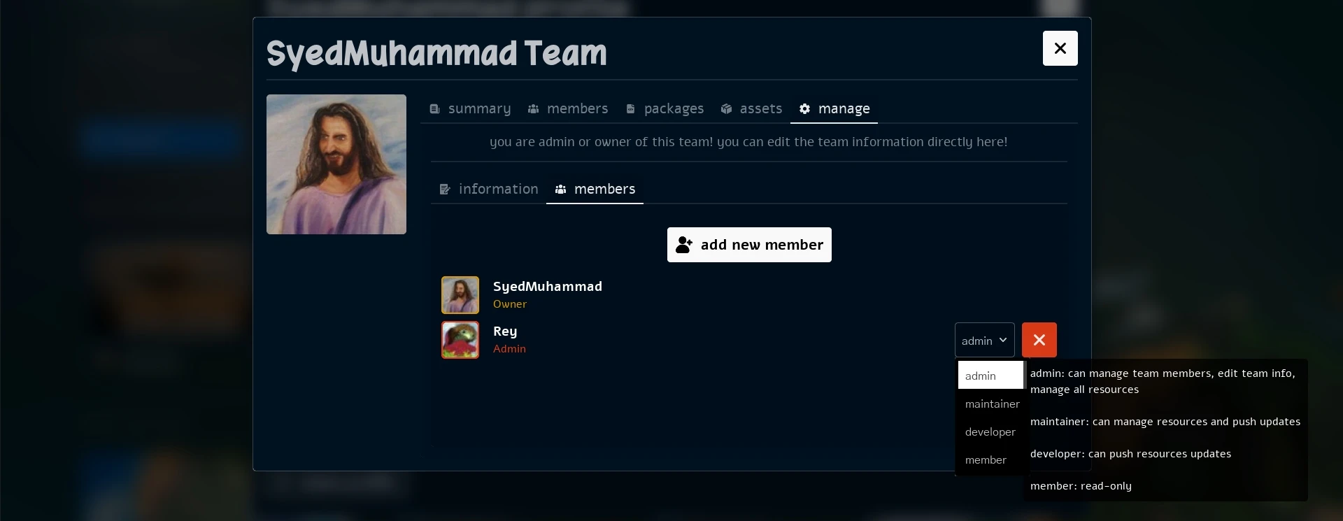 • Admin: Manage team members, edit team info, manage all resources